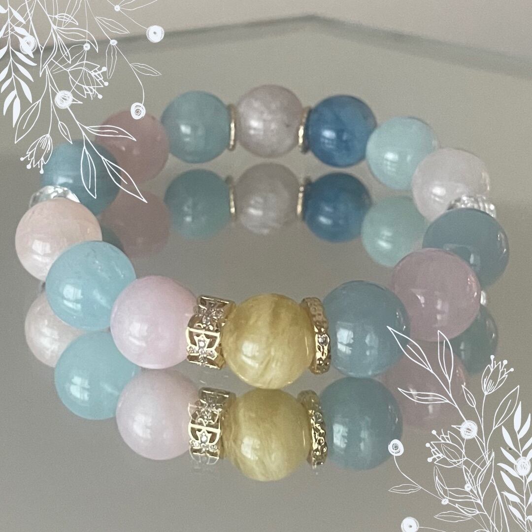 ローズクォーツ・アクアマリン・モルガナイト・ヘリオドール・エメラルドなどを総称してミックスベリルと呼ばれ、愛と癒しの波動で優しく包み込み忙しい毎日のストレスを落ち着かせてくれると言われています。