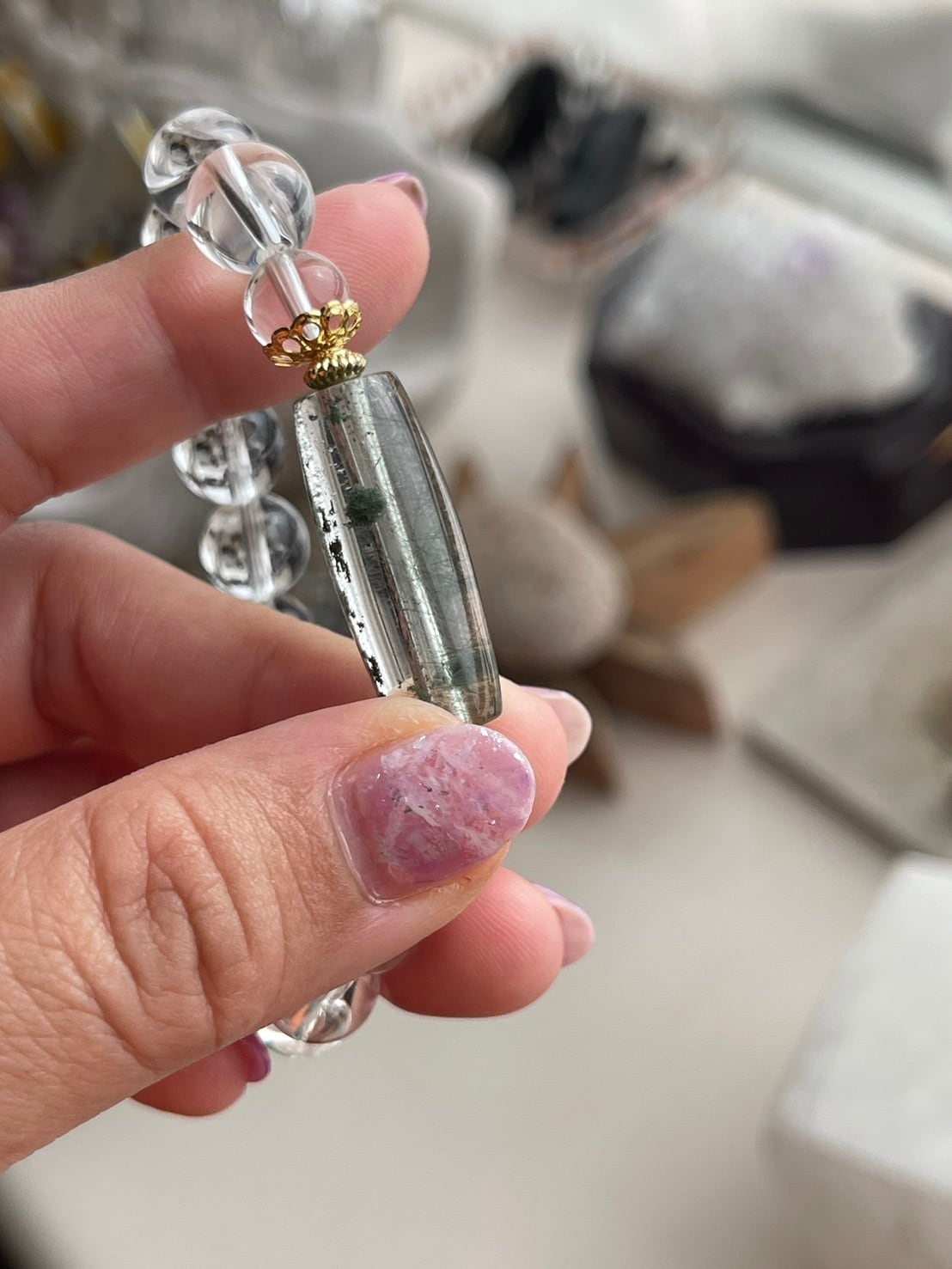 透明度の高いガネーシュヒマール水晶、クローライトも綺麗に入った天珠型デザイン!